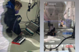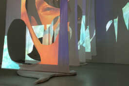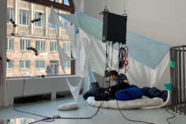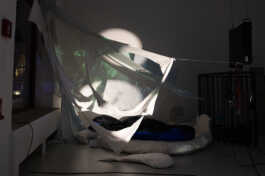 a wetness with limbs - with Simone Körner, 2021, expansive performance installation, ornamentic sound transducers attached to windows, amplifiers, beamer, cutout bed sheets, ornamentic pillows and mattrasses, sleeping bags, stripped and painted piano, round mirrors, 3d prints, dyed gloves, ceramics, metall balls, tattooing machine, and more...