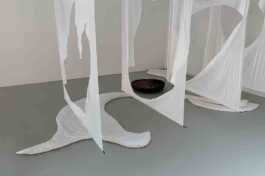 The vibras, which vibrate in bassy sounds, encourage you to put them on your body with various furrows and hollows in which you can place your extremities and which comfort your hand. The object is meant to allow a playful exploration of tactile experience. It sits somewhere between futuristic machine part and sex toy, liberating the playfulness of the vibrator from its fixation on the genital area and extending it to the whole body. Vibration has been a constant companion of humans since industrialisation and the technification of our infrastructure, feeding our desire for the combustion engine that encapsulates us, envelops us in sound and lulls us down. The Vibras, on the other hand, artefacts of a shrunken automobile body, are carried by us like cocoons speaking to us about a time after the combustion engine. They naturally bring the body into poses of care and tenderness. The car seat on which the Vibra rests, draped in soft blankets like a baby in its cradle, is disguised. From below, vibration-damping foam, which is installed in cars, spills out of the seat. Sound, as vibration, is fundamentally tactile. In this respect, it is a logical consequence to extend hearing to the entire skin and to address the skin and the body in its entire physicality with vibratory sound art. This changes the accessibility for recipients and people with visual or hearing difficulties can also experience this tactile sound sculpture, perhaps even in a particularly good way. The ten-minute composition is played through built-in battery-powered electronics. The bass waves travelling through the body create a dissociative feeling. The hard 3d-printed object does not deliver the promised wellness and yet one does not want to let it go.